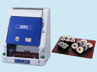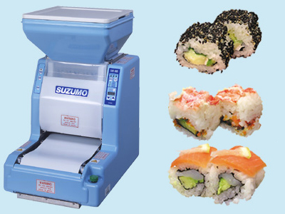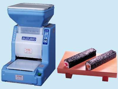 Designed to enable maki sushi to be made without the stress of manually making sheets of rice and rolling. Using the various folding plates, all sizes of maki can be made. For example, Hosi 25nm, Chu-maki (35mm), Futo (46mm) and even inside-out rolls known as Uramaki. The controls can be set or adjusted to vary the thickness and density of the rice sheet, enabling delicious rolls such as California roll to be easily made quickly.